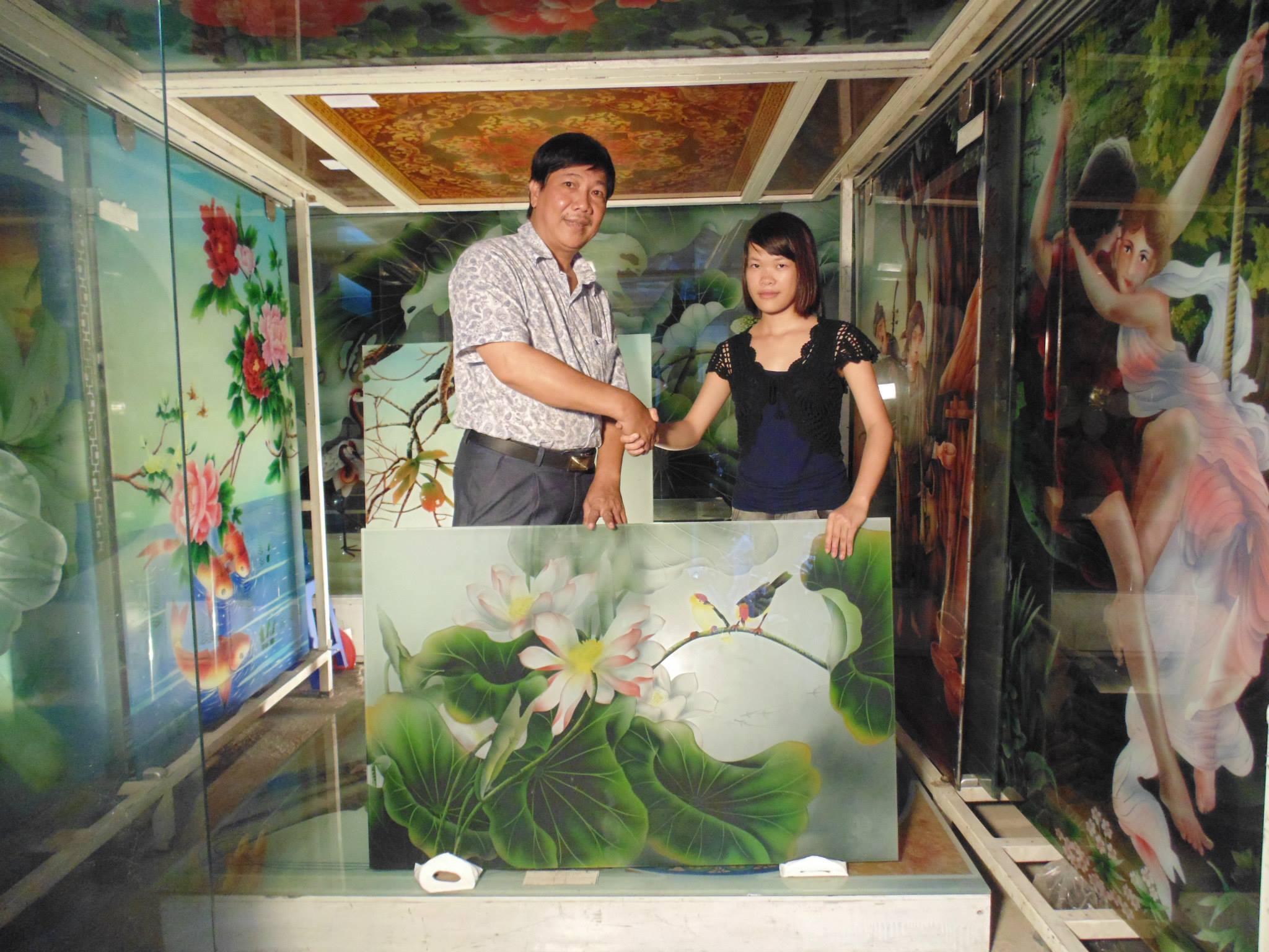 +tranh kính điêu khắc với đủ công nghệ đã đăng ký với nhà nước, thủ công nhưng phần đồ họa phải qua hệ thống máy tính để lưu dữ liệu và tăng nét cho tác phẩm