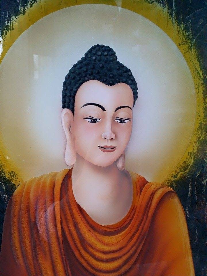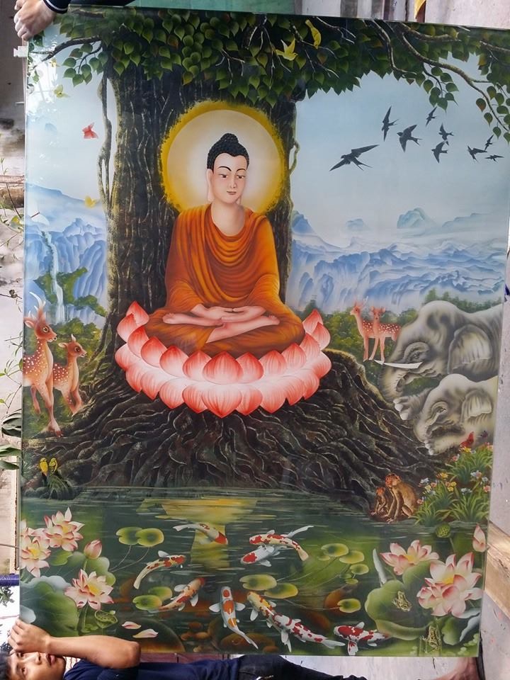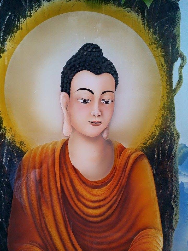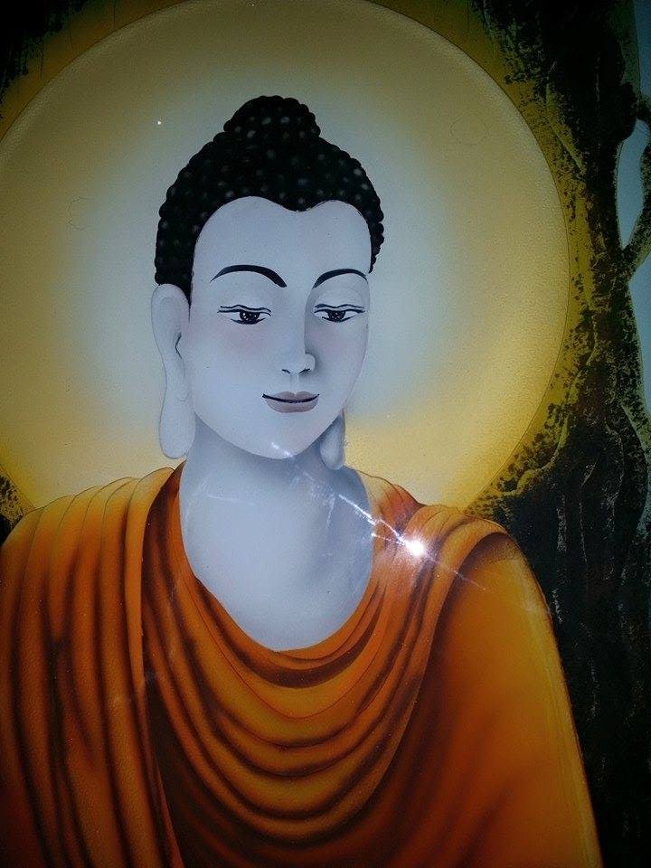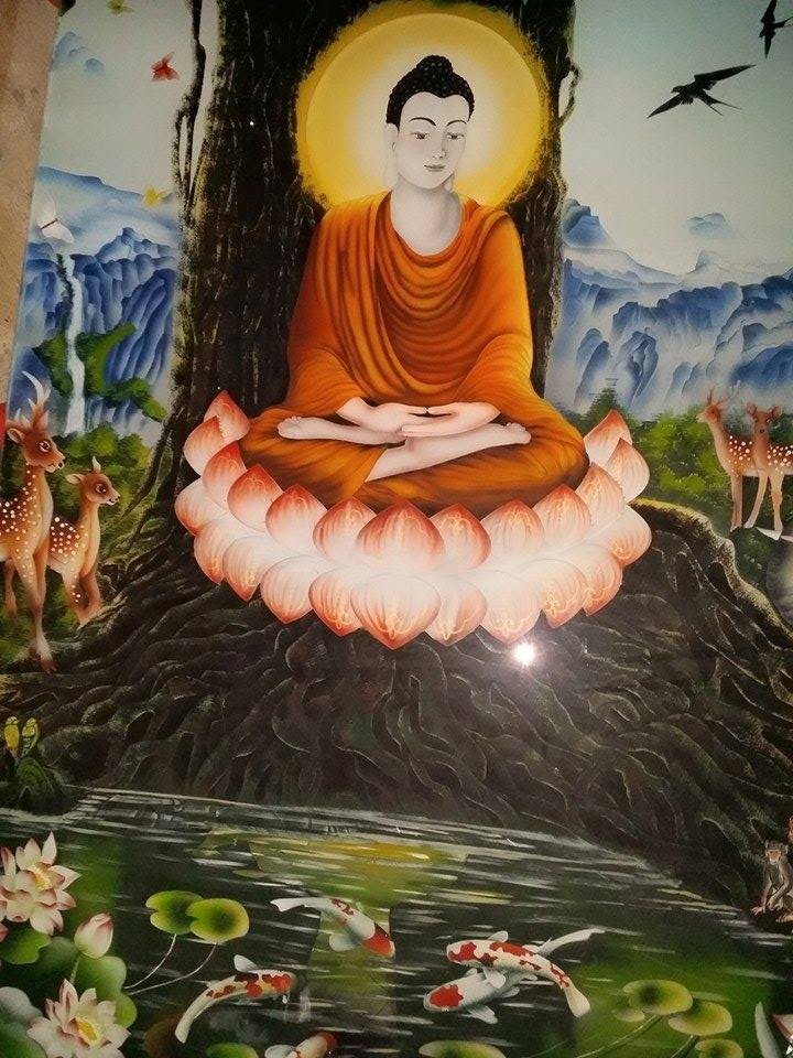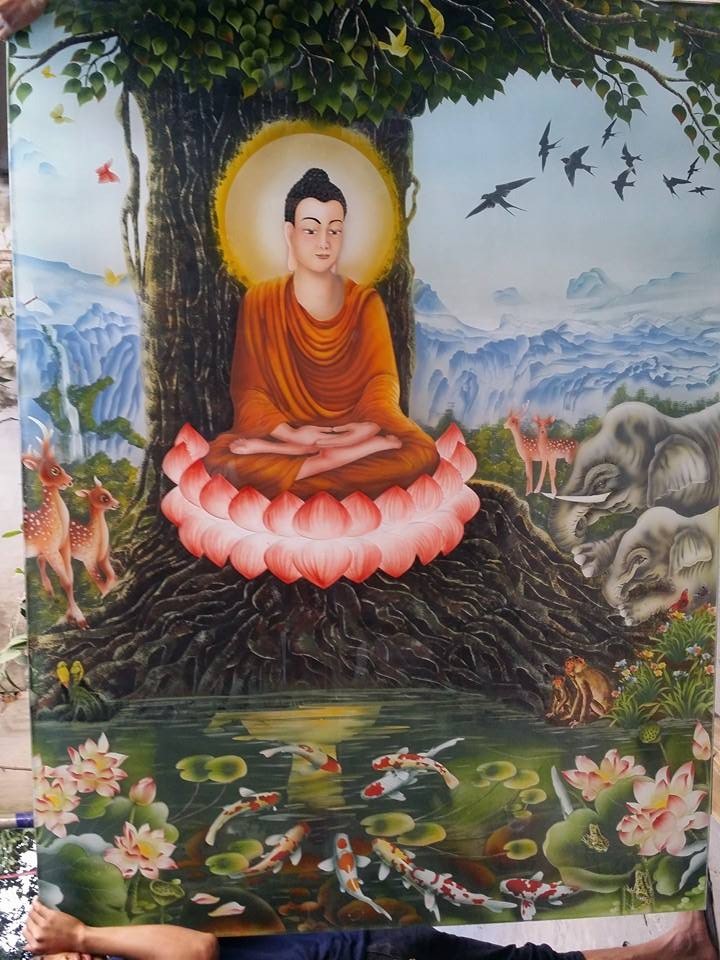 Tranh kính Đức Phật Thành đạo của vinhcoba sáng tác không có gì đặc biệt lắm . Bức tranh thể hiện nhìn từ trái sang phải , trước mặt là hồ cá cửu ngư quần tụ ,trên là chim én mùa Xuân , ong bay bướm lượn năm mầu , trăm hoa đua nở , những con vật hiền lành hay hung dữ cũng trở thành bạn , ánh mắt của đức phật quan tâm đến là hai chú nhái cốm trên lá sen , loài lưỡng cư nhỏ bé . Đức phật ngồi quy về hướng đông , lưng...