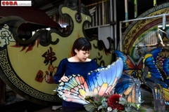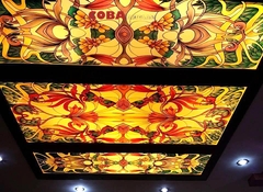 Tác phẩm: Trang trí Trần phòng khách. Nghệ thuật kính điêu khắc màu men gốm Ceramic nung chảy 700 độ C. Chất liệu: Kính an toàn cường lực, khung thép kết hợp...
