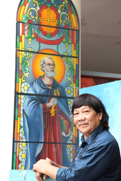Bức tranh kính bị vỡ của nhà thờ Công giáo được ông tái tạo
